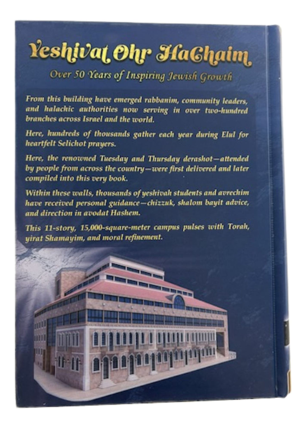 Yeshivat Ohr HaChaim. Over 50 Years of Inspiring Jewish Growth From this building have emerged rabbanim, community leaders, and halachic authorities now serving in over two-hundred branches across Israel and the world. Here, hundreds of thousands gather each year during Elul for heartfelt Selichot prayers. Here, the renowned Tuesday and Thursday derashot-attended by people from across the country —were first delivered and later compiled into this very book. Within these walls, thousands of yeshivah students and avrechim have received personal guidance-chizzuk, shalom bayit advice, and direction in avodat Hashem.