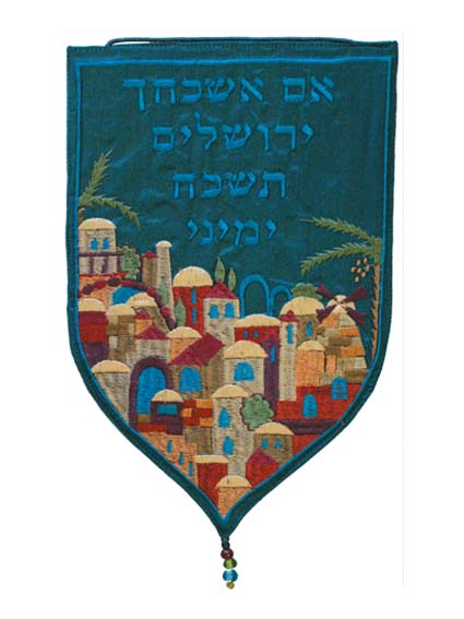 Wall hangings are an attractive and exceptional addition to the walls of any room of your home, the perfect finishing touch to your entryway, or living and dining room. This gorgeous embroidered tapestry starts as a rectangular shape and tapers to a point at the bottom, creating an remarkable yet classic shape. The hanging is made in a stunning teal base color and is embroidered beautifully with a colorful view of the holy land of Jerusalem with the saying Im Eshkachech Yerushalayim Tishkach Yimini ("If i forget you O Jerusalem let my right hand wither").The fringes are made from glass beads. The tapestry can be hung from the attached string.This is a wonderful house warming gift, as well as a great gift for Shabbat or any other special occasion.Size (Approx.):10in x 6in